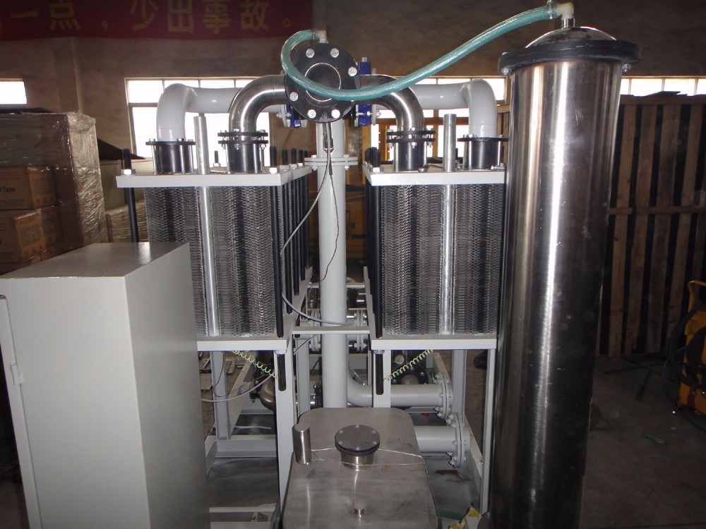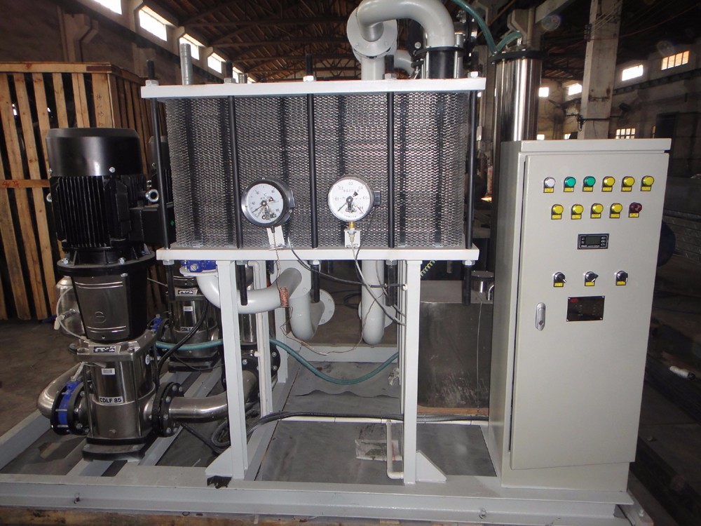 本產(chǎn)品由熱交換器、離子交換器泵組、高位膨脹水箱、管道和電氣控制等部件組成。水-水熱交換器采用波紋平板式,其換熱原理為將從整流器流進之載熱純水熱量以間壁傳熱方式傳遞給付水輸出機外,冷卻后的純水經(jīng)加壓后返回整流器水道,周而復(fù)始,形成閉合循環(huán)冷卻回路。離子交換器采用混合床形式制取純水以維持主回路于額定水質(zhì)。泵組由二臺互為工作、備用的不銹鋼水泵組成,是主回路的動力源。高位膨脹水箱按放位置高于負載主機,具自動集氣和排氣之功能。主回路管道通過外接管與負載主機冷卻水道連接成閉合循環(huán)回路。機內(nèi)各容器和主水管路均采用不銹鋼材質(zhì)制造。